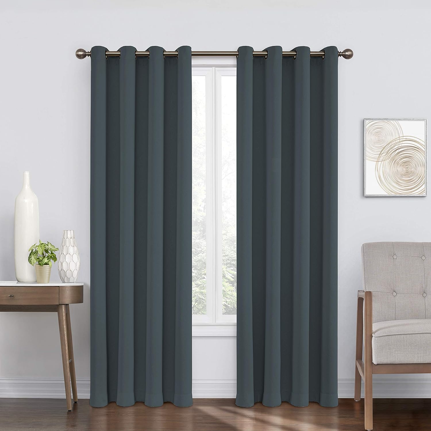 The curtains in this video will include curtain grommets at the top which slide on a curtain.